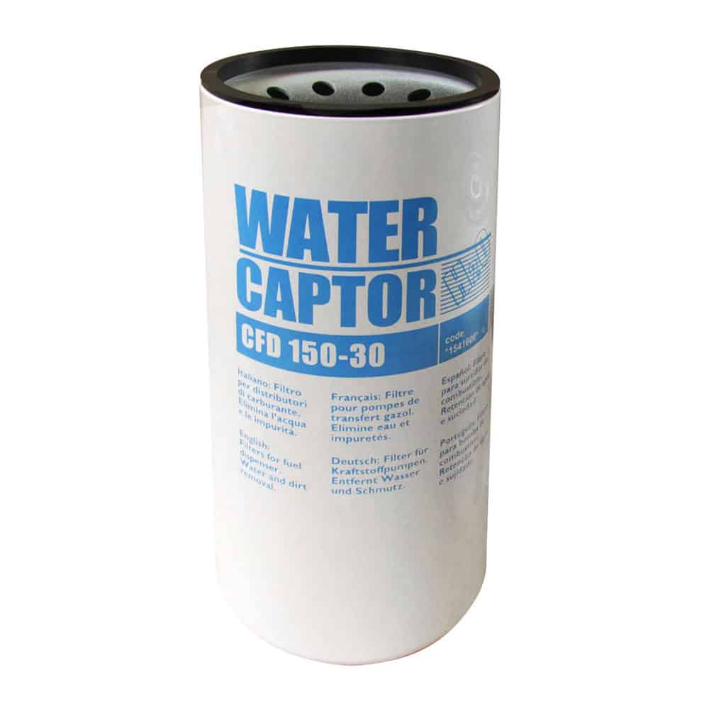 Filtro separador de agua Water Captor con cartucho de absorción de agua, ideal para gasóleo. Protege motores eliminando agua y sedimentos, con capacidad de filtración de 30 µm y caudal de 150 l/min.